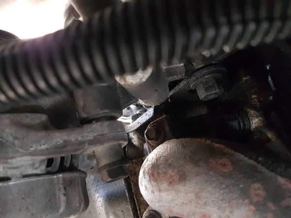 > Note that the bolt does not squeeze the two alternator lugs together, which could crack them - there is a press-fit spacer that slides in one lug to take up slack. (You may have to fiddle with the spacer to get the alternator out.)