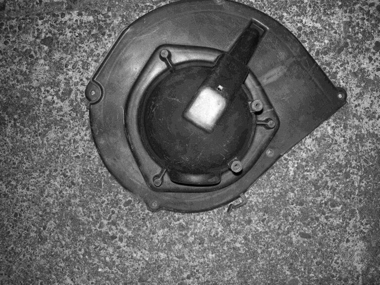 - through the glove-box opening you can see a plastic cylinder, with a join line at the bottom. The fan is in and secured to the part below the join line, which drops down once unbolted. We hope. Here's a look from below showing the domed lower fan housing (forward is top left, aft is bottom right, the join line is where the shade of plastic colour changes slightly). You can see the trim clip on the bottom, two 10mm screws holding dash structure to sidewall bracket (bottom left of photo), two screws holding the wiring bracket (bottom centre of photo), and even a missing dash trim-structure screw location (plus various wiring getting in the way).